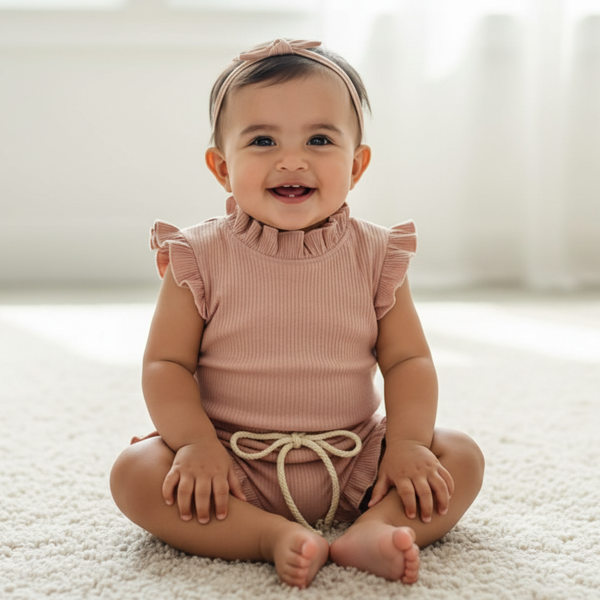 Tierno, fresco y lleno de estilo 💕. Este conjunto de dos piezas 100% algodón está diseñado para mantener a tu pequeña cómoda y libre durante todo el día. Su tela suave cuida la piel y su ajuste flexible se adapta al movimiento natural de tu bebé 👶.